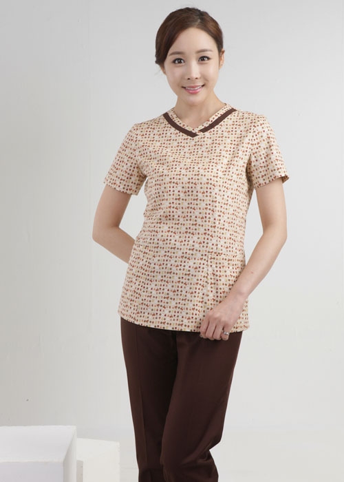 상의 : 베이지계열의 꽃무늬 나염 / 배색 : 밤색 / 하의 : 밤색