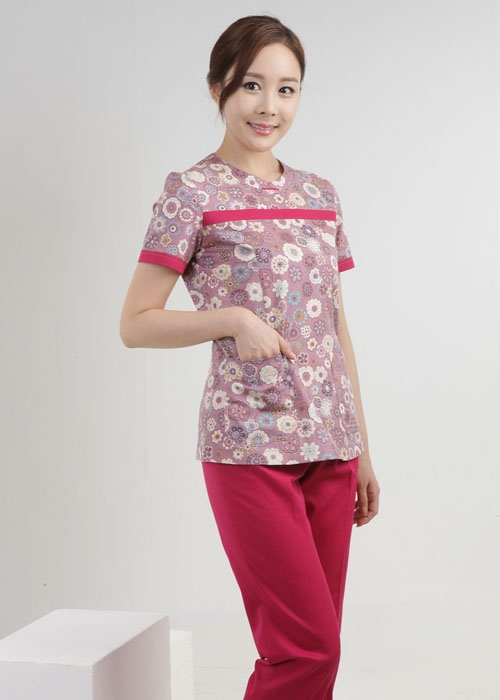 상의 : 보랏빛의 꽃무늬 나염 / 배색 : 진빨강 / 하의 : 진빨강