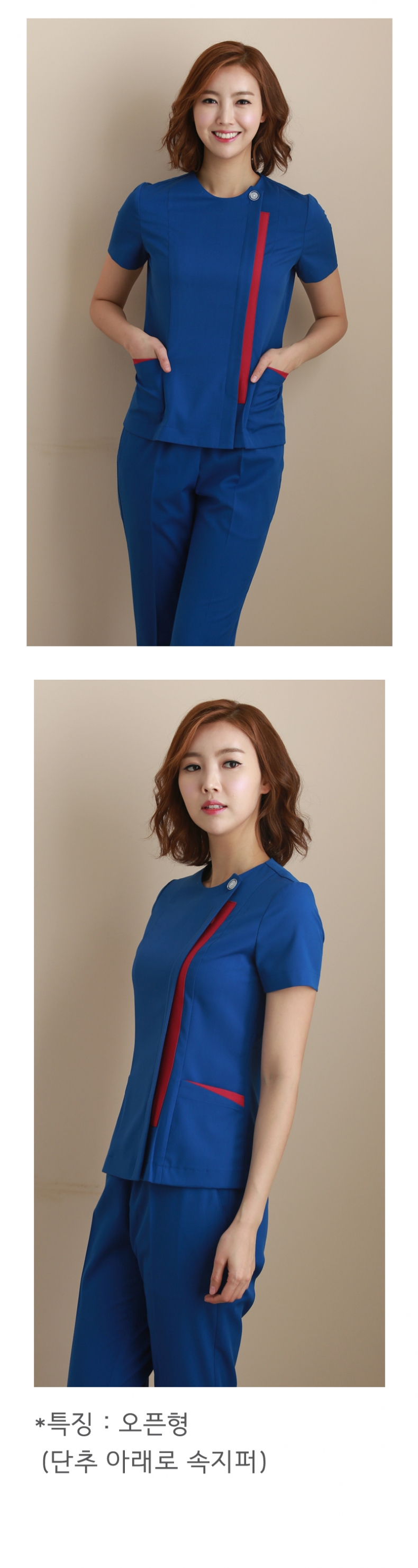 상의 : 진파랑 / 배색 : 진자줏빛의 핫핑크 / 하의 : 진파랑