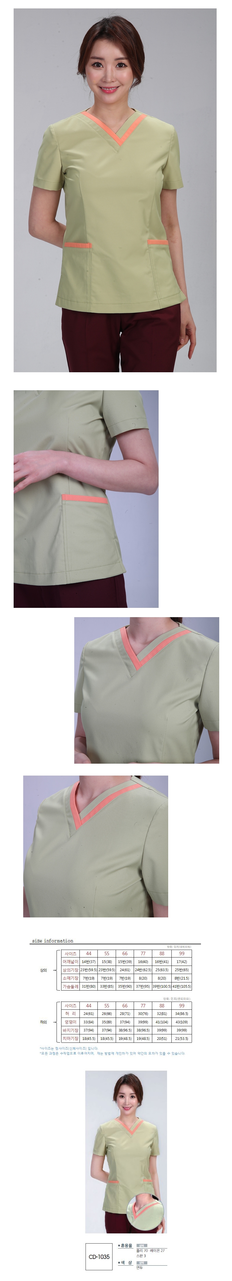 상의 : 밝은 풀색 / 배색 : 귤색